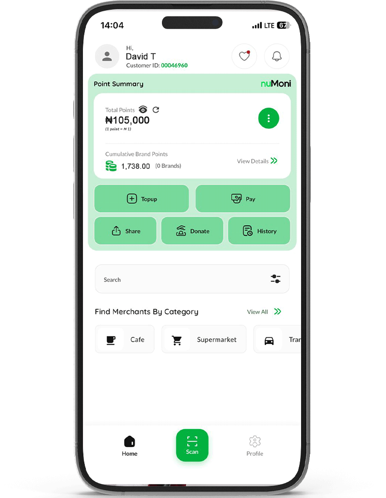 nuMoni is a digital reward wallet that gives you 5% extra value every time you top up. You can spend your rewards at partner stores, send to friends, or donate to causes — all without cash withdrawals.
