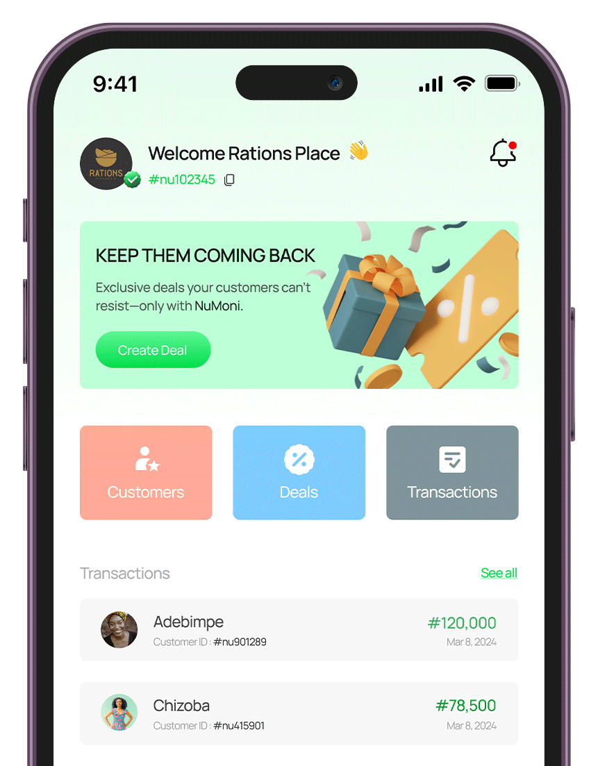With nuMoni, merchants across Nigeria are gaining visibility, increasing sales, and growing profits without the hassle of complex tools or costly advertising. From built-in referrals and instant loyalty rewards to real-time business insights, everything you need to grow is right at your fingertips. nuMoni empowers you to sell smarter, attract loyal customers, and scale effortlessly.